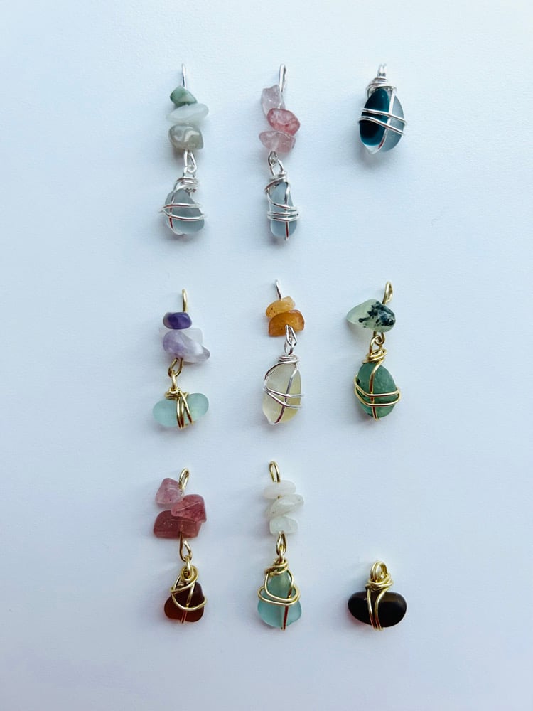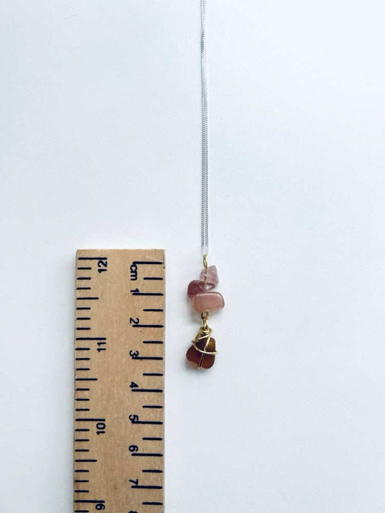 Amber coloured Sea glass piece approximately 1cm big wrapped in gold coloured wire with pink coloured crystals above, on a sterling silver diamond cut curb chain.