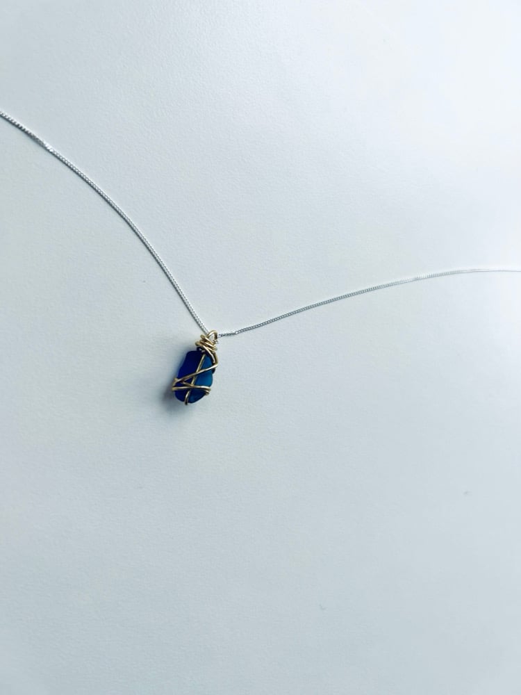 Light blue coloured Sea glass piece approximately 1cm big wrapped in gold coloured wire and on a sterling silver diamond cut curb chain. Chain is 18 inches long.